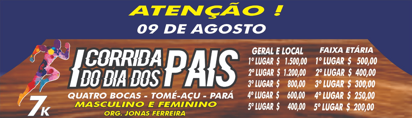 O evento acontecerá no dia 09 de agosto de 2026, com largada às 06h00, na localidade de Quatro Bocas, Tomé-Açu – PA. A prova contará com percurso aproximado de 7 km, reunindo atletas nas categorias Geral (outros municípios) e Comunidade Local (Tomé-Açu), além das disputas por faixa etária, conforme regulamento.
